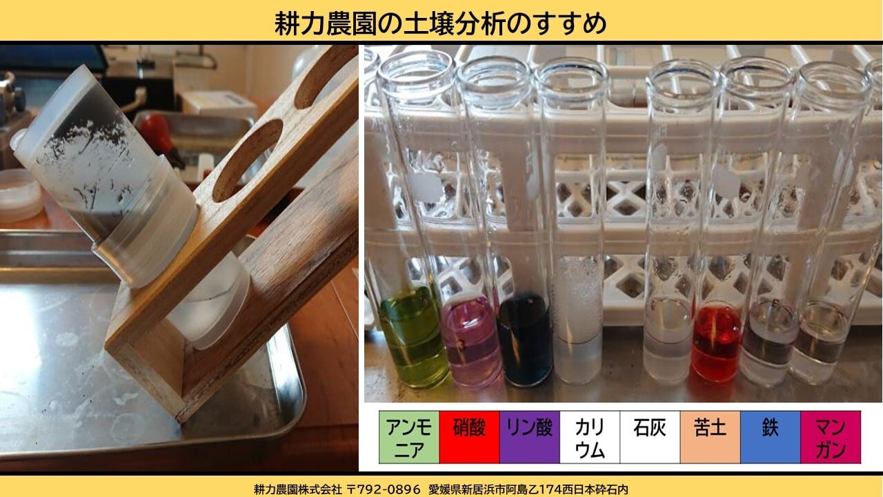 土壌分析&施肥設計の依頼方法 ①お申込みの後、土壌検体を右住所へ送ってください。〒792-0896 愛媛県新居浜市阿島乙174西日本砕石内 耕力農園 ②土壌検体の量は紙コップ1杯ほど、平均値がでるように、同一圃場内で5~7ヵ所の地点の土壌を採取し混ぜ合わせてから送ってください。採取する深さは田畑の場合は表面から10cm、畝のある場合は畝の土を採取、果樹の場合は枝の先端直下から幹側へ20%ほどの所を表層から深さ30㎝まで。③これから作る作物名および前作の作物名を記載してください。④土壌分析検査結果及び施肥設計(案)はPDFファイルにてeメールにて送らせていただきます。⑤検査項目 アンモニア態窒素・硝酸態窒素・可給態リン酸・交換性カリウム・交換性カルシウム・交換性マグネシウム(単位:㎏/10a)、可給態鉄・交換性マンガン(単位:ppm/10a)、pH以上。